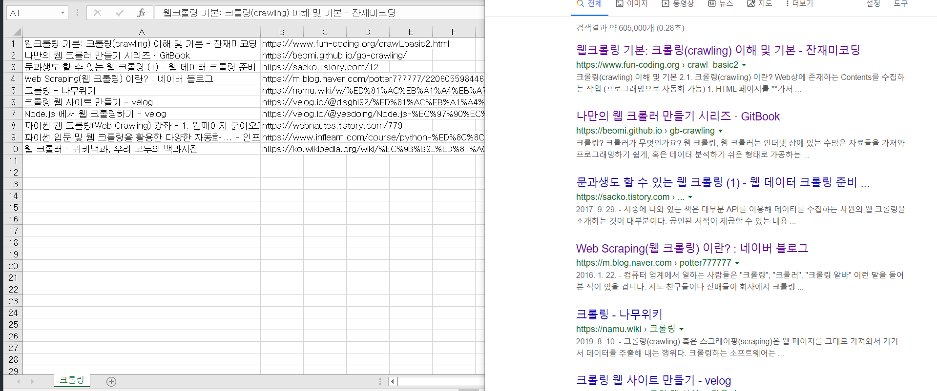 크롤링을 검색해서 나온 10개의 결과 값을 저장했습니다.(구글)
